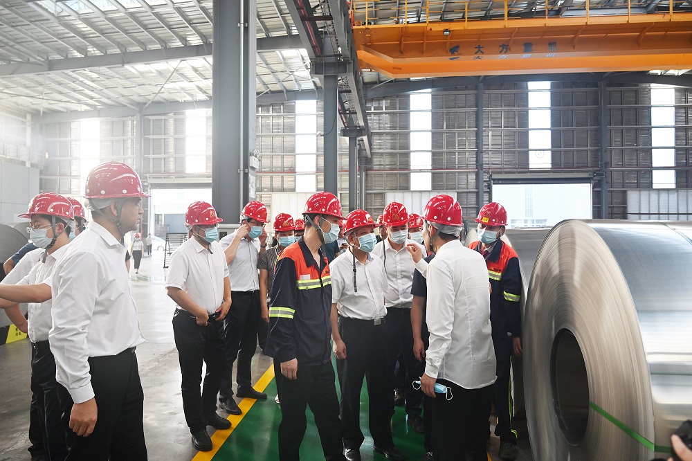 调研组一行走进福安青拓冷轧科技有限公司,实地察看青拓不锈钢冷轧及深加工配套项目。姜海洪为调研组详细介绍冷轧深加工产业链工艺流程以及公司即将生产出的具有高强度、高品质、高附加值的不锈钢新材料产品,他特别强调,青拓集团的轧制水平将于9月中旬达到0.03mm,达到手撕钢轧制的超薄高端目标。