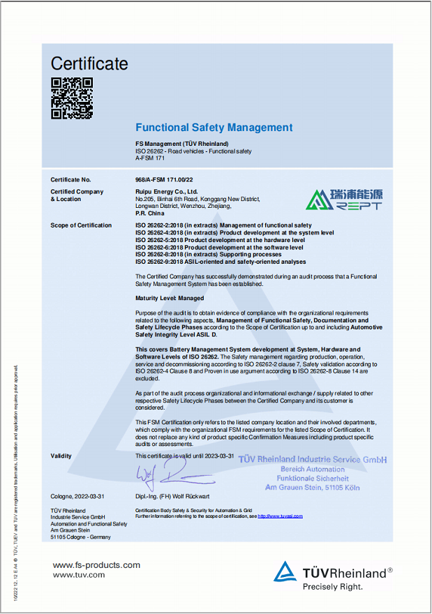 近日,瑞浦兰钧能源股份有限公司获得由国际独立第三方检测、检验和认证机构德国莱茵TÜV颁发的ISO 26262功能安全管理体系ASIL D等级认证证书。