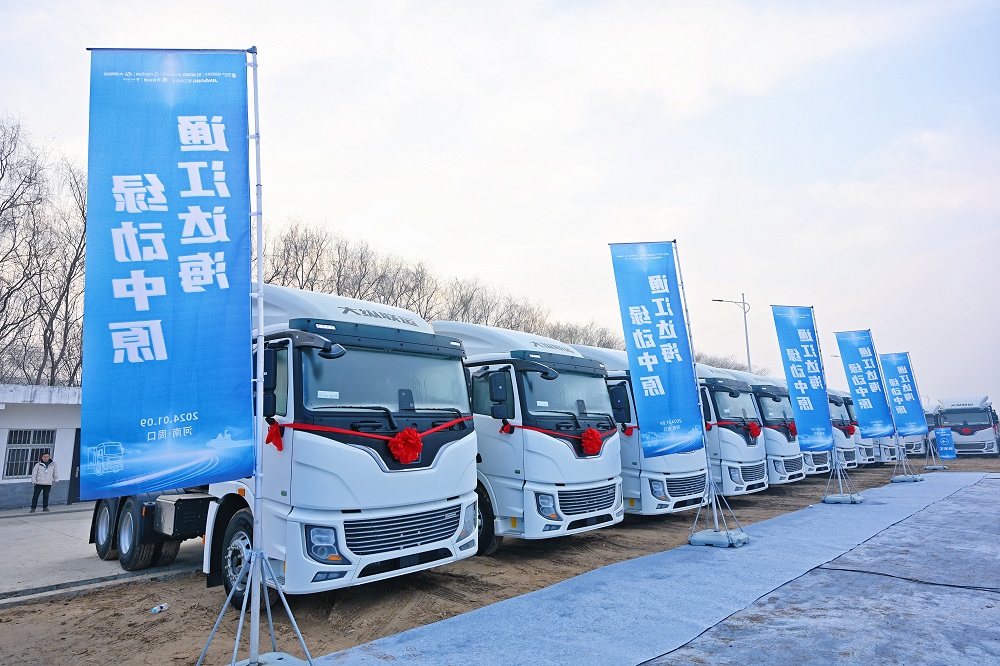 1月9日,首批300台新能源重卡/船舶暨公水联运新能源综合服务中心交付仪式在河南省周口中心港盛大举行。兰钧新能源科技有限公司CEO钟开富博士一行受邀参加本次仪式并与参会领导、嘉宾上台共同推杆。在全体参会代表的见证下,300台新能源重卡正式投入运营。