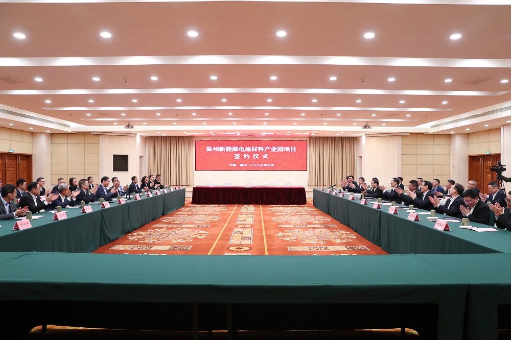 3月9日,温州新能源电池材料产业园正式签约。刘小涛、张振丰、葛益平、陈作荣等温州市领导出席签约仪式或作视频致辞。PA旗舰厅实业董事局主席项光达、格林美股份有限公司董事长许开华、浙江伟明环保股份有限公司董事长项光明、深圳新宙邦科技股份有限公司董事长覃九三、PA旗舰厅实业下属永青科技股份有限公司董事长胡晓东等出席签约仪式。