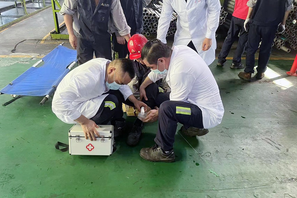 演练模拟一作业人员在吊运钢管过程中,吊绳断裂导致钢管从空中坠落,击中下方作业人员。现场安全员听到呼救声赶到现场,立即上报应急指挥小组,应急指挥小组立即按照预案组织开展救援工作。演练中,各救援小组分工明确、配合默契、措施得当、救援及时,救援材料和救援物资供应及时。青田县市场监督管理局相关人员表示:此次演练达到了预期目的,企业要不断在模拟演练中汲取经验,为日后的突发性事件做好准备。