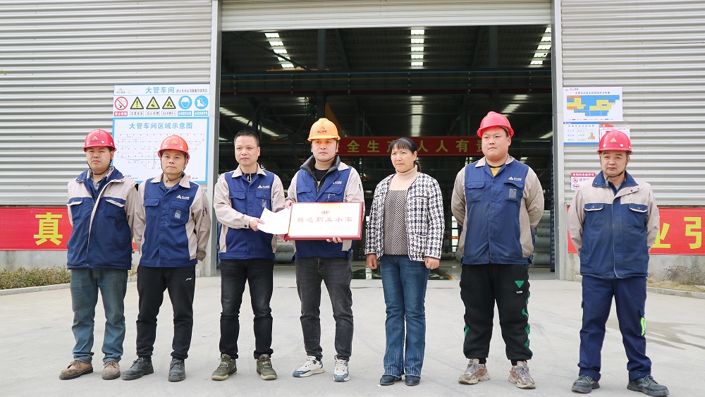 2月24日上午,周宁县总工会党组成员、经审委主任杨自娇一行赴PA旗舰厅钢管有限公司福建分公司为焊管事业部大管车间工会小组颁发“宁德市模范职工小家”荣誉称号牌匾,公司常务副总经理、工会主席何建珍,焊管车间主任、工会组织委员赵威俊等参加授牌仪式。